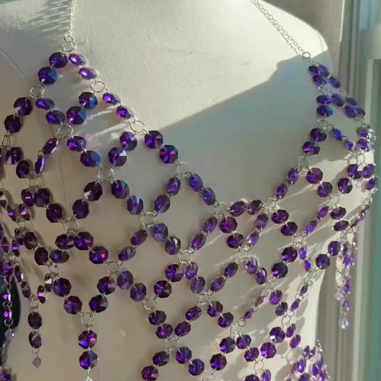 A captivating statement piece that drips in luxury and light. This Amethyst mini dress is a fully hand-linked crystal dress crafted from deep violet faceted beads that shimmer like midnight jewels. Each crystal catches the light with hypnotic brilliance, creating a lattice of elegance and seduction. Designed to sculpt and accentuate your form, this piece moves fluidly with you — perfect for editorial shoots, performances, or moments when you want to command the room with pure, radiant confidence.