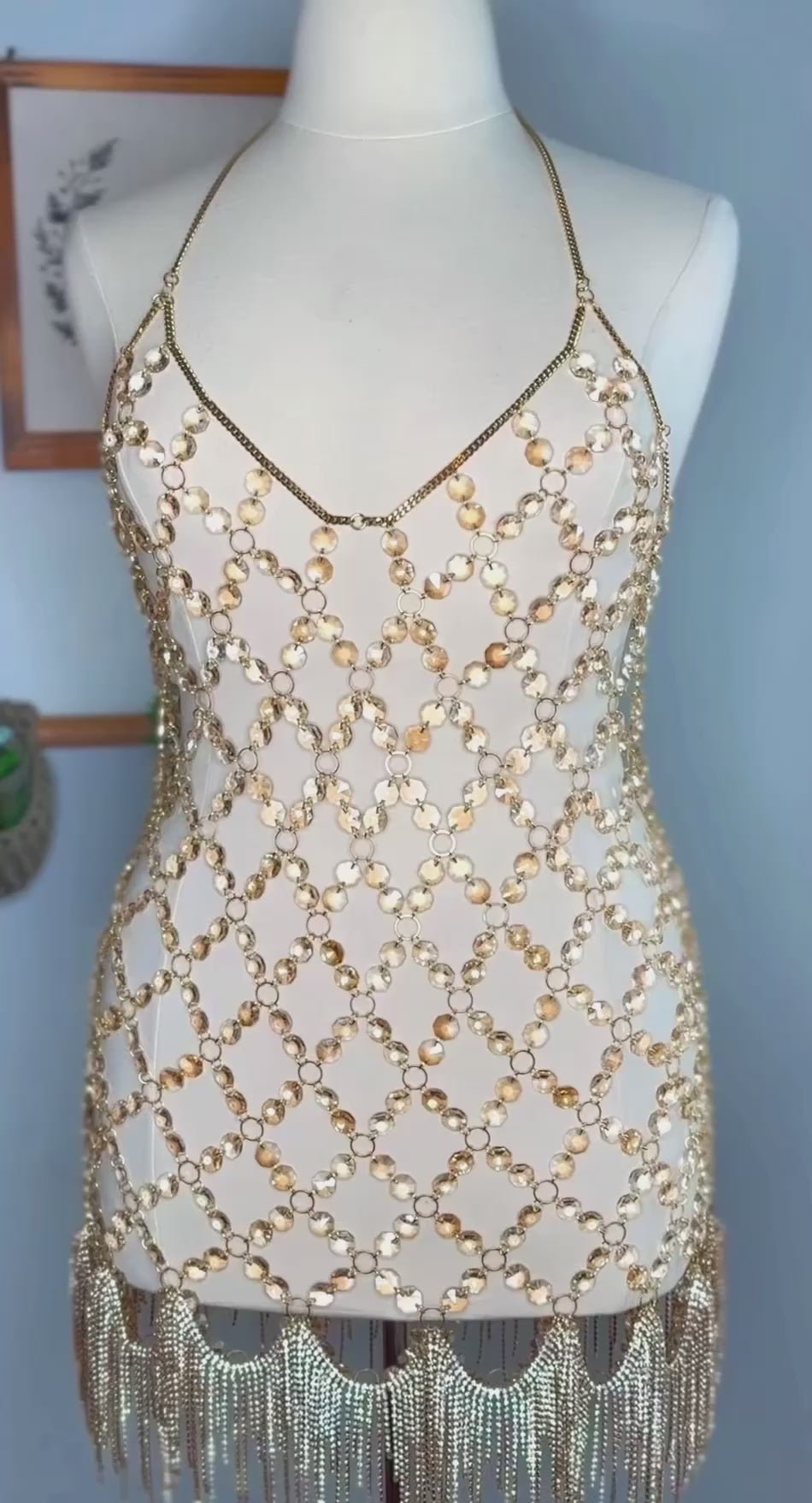 The Showgirl dress is a showstopper designed to shimmer with every movement. Featuring a delicate gold-tone chain framework adorned with faceted champagne crystals, it drapes the body in an elegant lattice that catches the light from every angle. The silhouette is finished with cascading crystal fringe along the hem, creating fluid motion and a touch of vintage glamour.