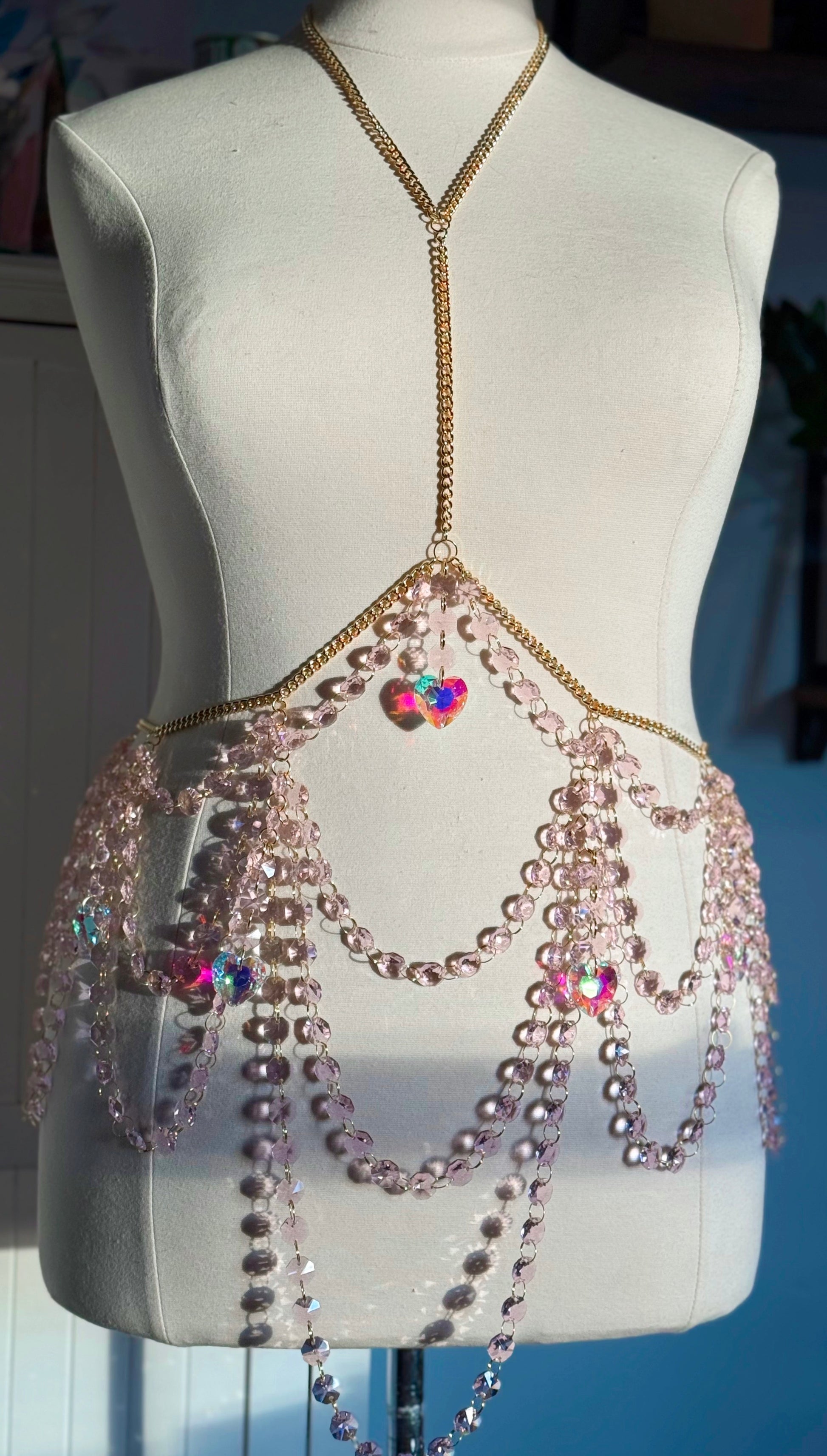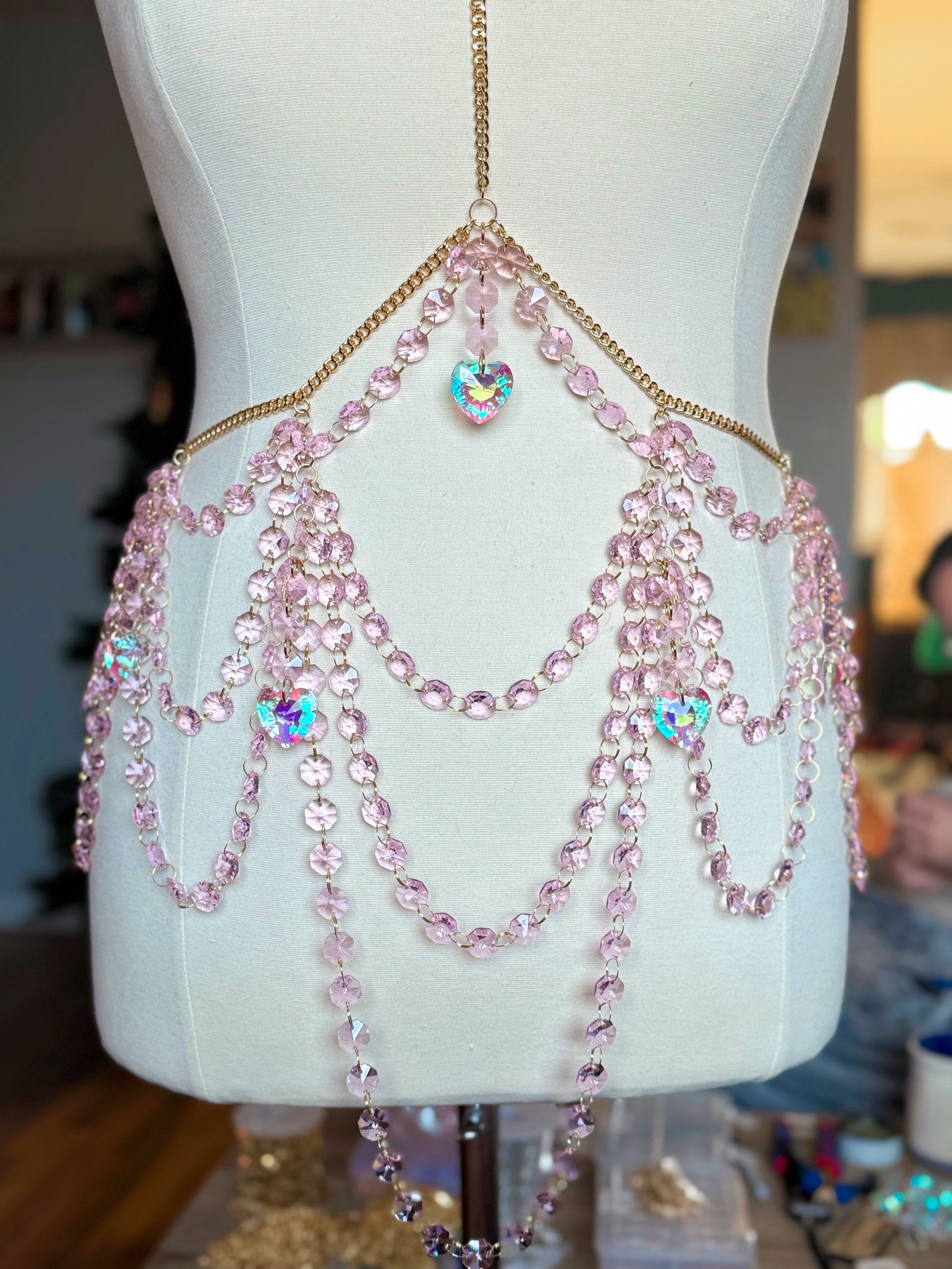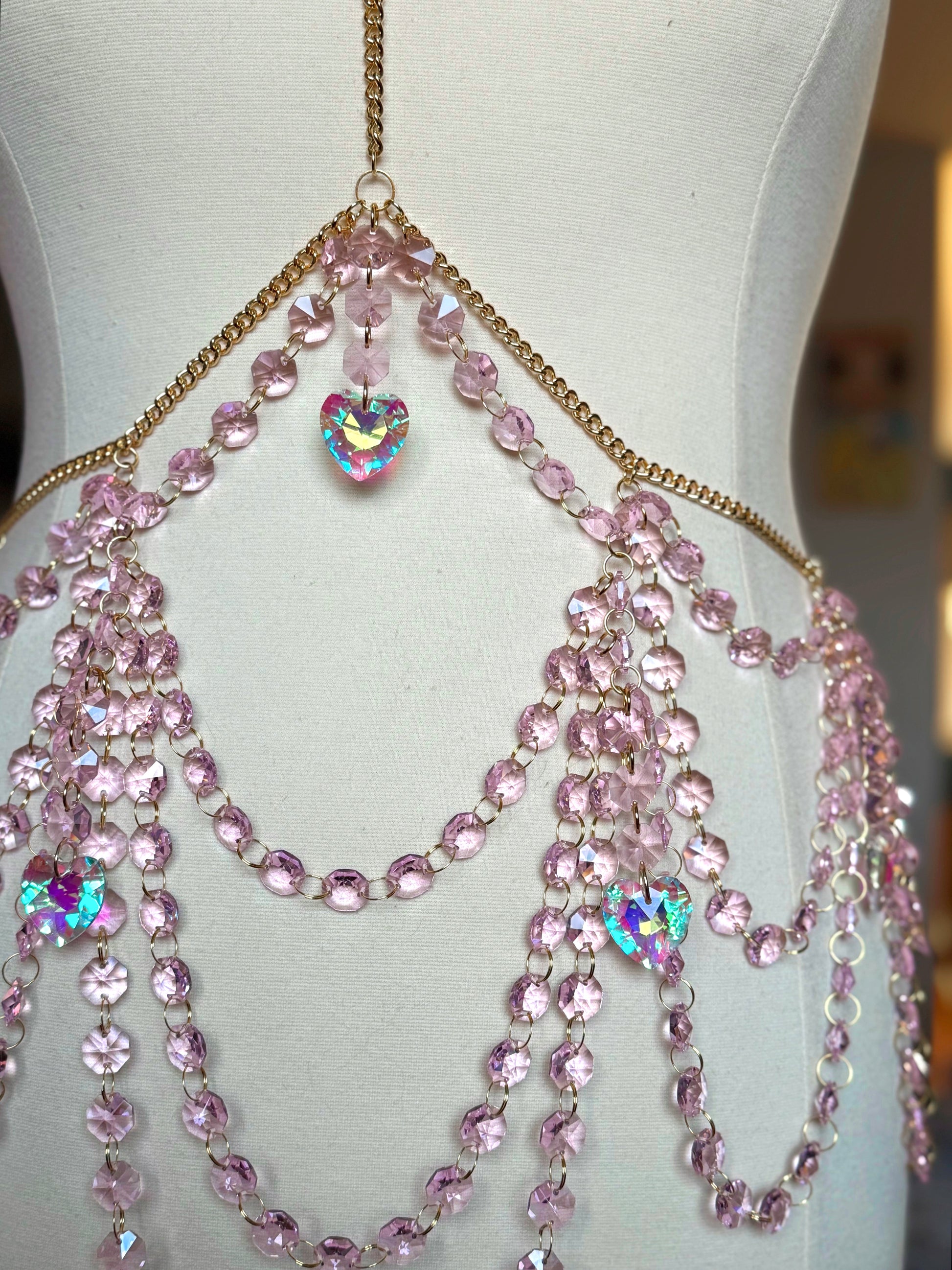 Babe, this piece is everything! It’s a gold chain body harness dripping in these gorgeous, soft pink crystal strands that sparkle like crazy in the light. And let’s talk about the heart charm in the middle—hello, it’s giving full-on magical vibes with that rainbow shine! It’s cute, dreamy, and totally extra in the best way possible. Perfect for when you want to steal the show and look like a literal goddess.